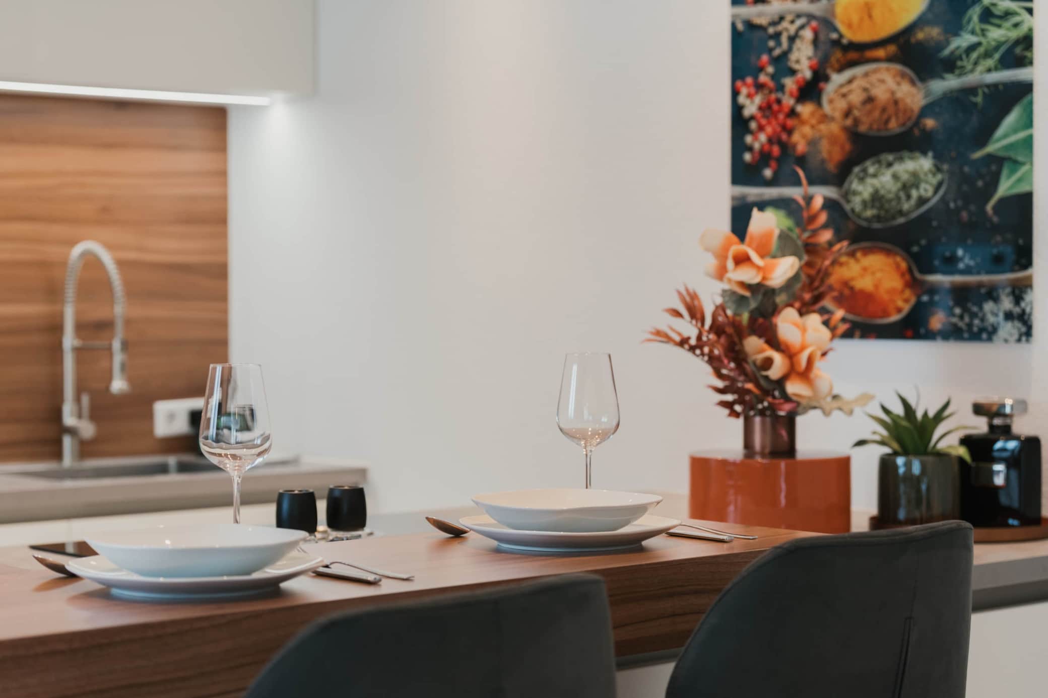 Das Schlafzimmer bietet ein Kingsize-Bett und einen großen Kleiderschrank. Die voll ausgestattete Küche mit Bar (4 Plätze) verfügt über Induktionskochfeld, Backofen, Geschirrspüler und Kaffeemaschine.